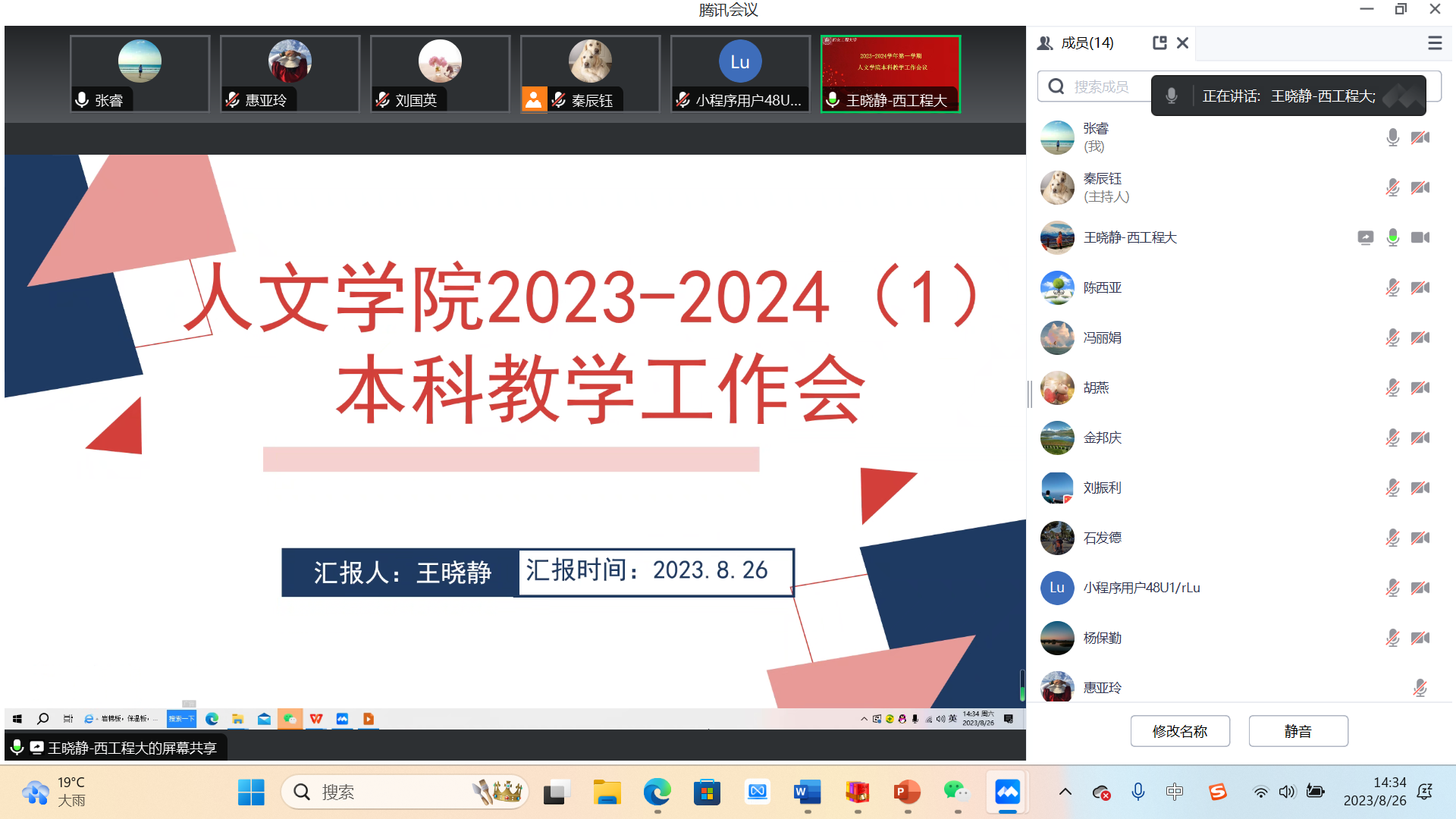 8月25日下午,我院召开人文学院2023年秋季学期第一次线上教学工作会。副院长王晓静,各系部主任、副主任及教务员秦辰钰参加本次会议。