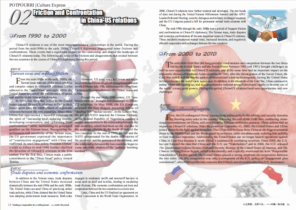 《POTPOURRI》第十三期在以往的基础上不断改进,充实内容,创新形式,共设置名家名作、文化速递、娱乐氧吧、翻译园地、写作园地以及毕业季六大版块。前五大版块紧扣德育美育、思政教育和文化自信主题,内容涵盖名著《月亮与六便士》的解读,中美外交关系的历程与未来合作展望,第十九届杭州亚运会的介绍,纺织服装类翻译与口笔译名家的访谈,以及讲好中国故事、传播中国声音等专题。毕业季板块则收集整理了2020级毕业生的精彩瞬间和部分优秀学生风采展示,作为送给毕业生的特别礼物。