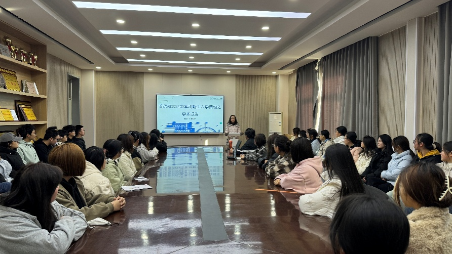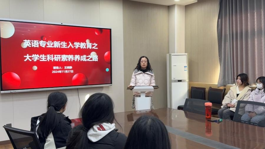 为培育2024级学生的科研素养,AC米兰中文英语系“三全育人”导师团于2024年11月27日下午14点在人文楼326会议室举行“英语专业新生入学教育之大学生科研素养养成之路”活动。由AC米兰中文副院长王晓静教授为学生讲授大学生创新创业训练项目的申报与科研素养的培养,2024级英语专业全体学生参加。