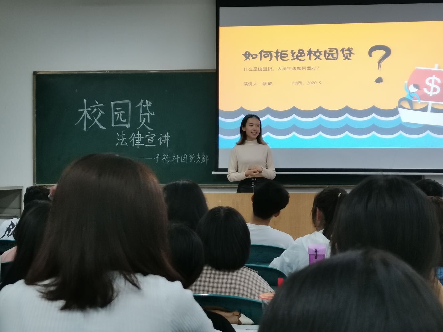 为提高大学生对于校园贷危害性和规避盲目消费风险的意识,树立理性消费理念,自觉远离网络借贷行为。子衿社团党支部成员发挥党员模范作用和所学法律专业特点,在子衿社团党支部书记郭欣欣的指导下,经过认真准备,反复推敲和演练。于9月29日下午,人文学院子衿社团党支部宣讲团走进教室,走到学生中进行校园贷法律宣讲活动。