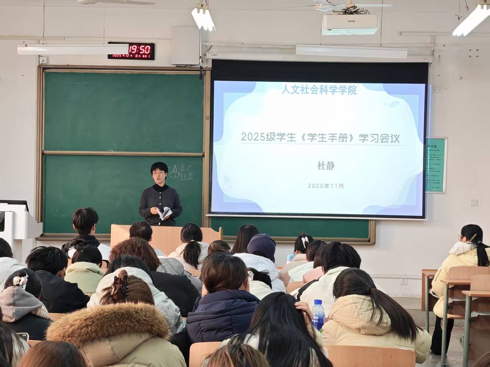 为扎实推进新生入学教育,强化校纪校规意识,引导学生树立自律观念、规范日常行为、提升自我管理能力,AC米兰中文于2025年11月14日晚在教学楼A110教室组织开展了2025级新生《学生手册》专题学习活动。本次活动由学院学生工作办公室主任、2025级辅导员杜静主讲,全体2025级本科生参加。